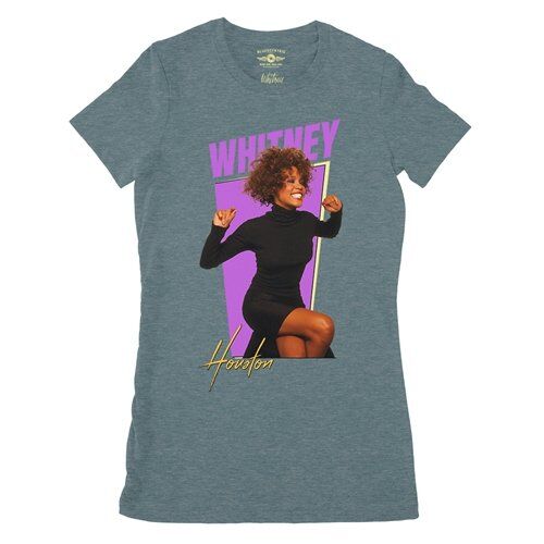 This Bluescentric Brand ladies Whitney Houston t-shirt is available in relaxed fit sizes up to 2XL. The material is a 4.2 oz 100% airlume combed and ringspun cotton with side seams. Heather colors are 52/48, Athletic Heather is 90/10, Heather Prism colors are 99/1.