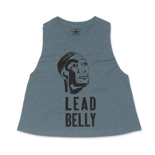 The Bluescentric Brand authentic Lead Belly Racerback Crop Top comes in relaxed cropped-fit sizes Small through 2XL. It is 52% airlume combed/ring-spun cotton, 48% poly jersey, racerback and features raw edge (unsewn) arm holes.