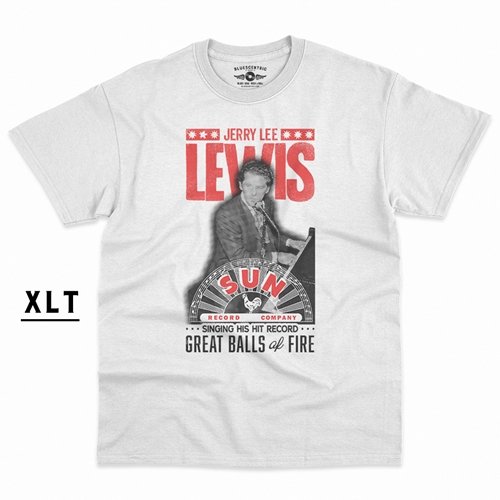 This Bluescentric Brand XLT Sun Records x Jerry Lee Lewis t-shirt comes in preshrunk 6oz 100% cotton sizes XLT, 2XLT and 3XLT. Sizes run very true, and have minimal, if any, shrinking. This is a standard go-to t shirt for our big & tall music lovers.