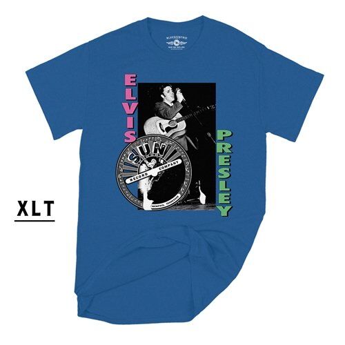 This t-shirt features an image of a hip-gyrating Elvis Presley singing into a microphone with a guitar strapped around his neck. It reads "Elvis Presley" in the traditional pink & lime like his first album cover. The circular Sun Records logo is in the bottom, an inseparable part of the Elvis story.