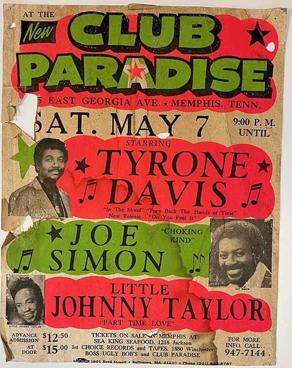 When Club Paradise opened in 1965, Memphis was fast becoming the center of the musical world at the time, thanks to the contributions of record labels like Stax, Sun and Hi Records, which were all at their respective peaks.